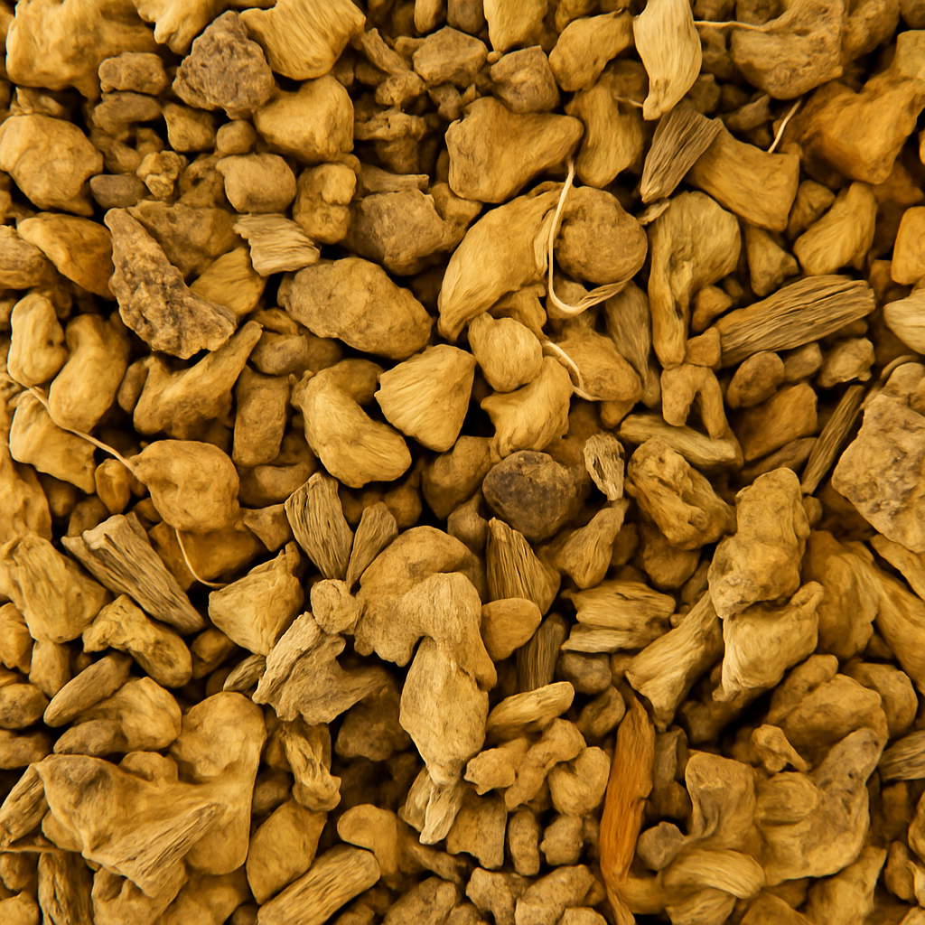 The mature root is thick, branched, and fibrous, with a significant length below ground. Upon drying, it retains a dense internal structure and develops a light tan to golden-brown exterior, while its interior remains pale and firm. The cut and sifted form showcases the coarse, woody texture of the root, presenting a rugged appearance that's well-suited for blending or display.